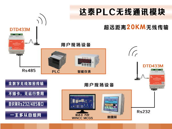 PLC無線通訊模塊20年工業無線測控行業經驗沉淀所研發,DTD433M采用全數字無線加密的傳輸方式,通過Rs485/232接口與PLC、DCS、智能儀表及傳感器等設備組成無線測控網絡。達泰PLC無線通訊模塊同時能與組態軟件、人機界面、觸摸屏、測控終端等工控產品實現無線485協議、西門子PPI協議、MODBUS協議、三菱N:N協議、臺達PLC、歐姆龍PLC的通信協議等的組態,為工業測控領域提供了遠距離無線通信的解決方案,大大節省了系統集成商現場調試和售后維修服務的時間及費用。PLC無線通訊模塊DTD433M既可以實現點對點通信,也適合于點對多點,分散不便于挖溝布線等應用場合,傳輸距離可達50KM,簡單,可靠,高效。